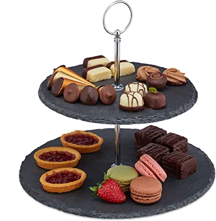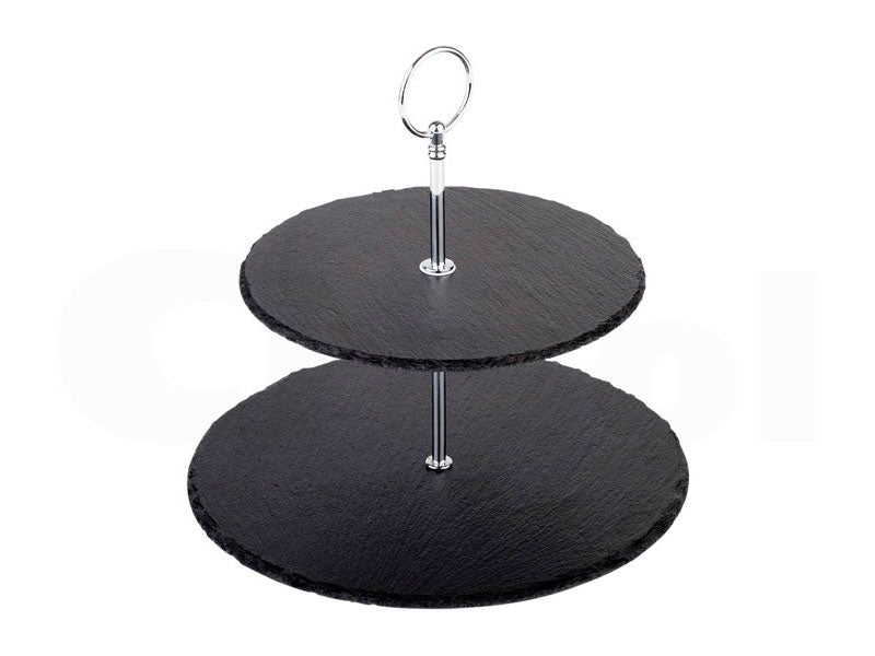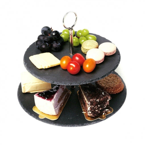 Impresiona a tus invitados con esta bandeja expositor redonda a dos alturas, fabricada con pizarra 100% natural, que ofrece una presentación sofisticada y funcional para tus platos, tapas y aperitivos.